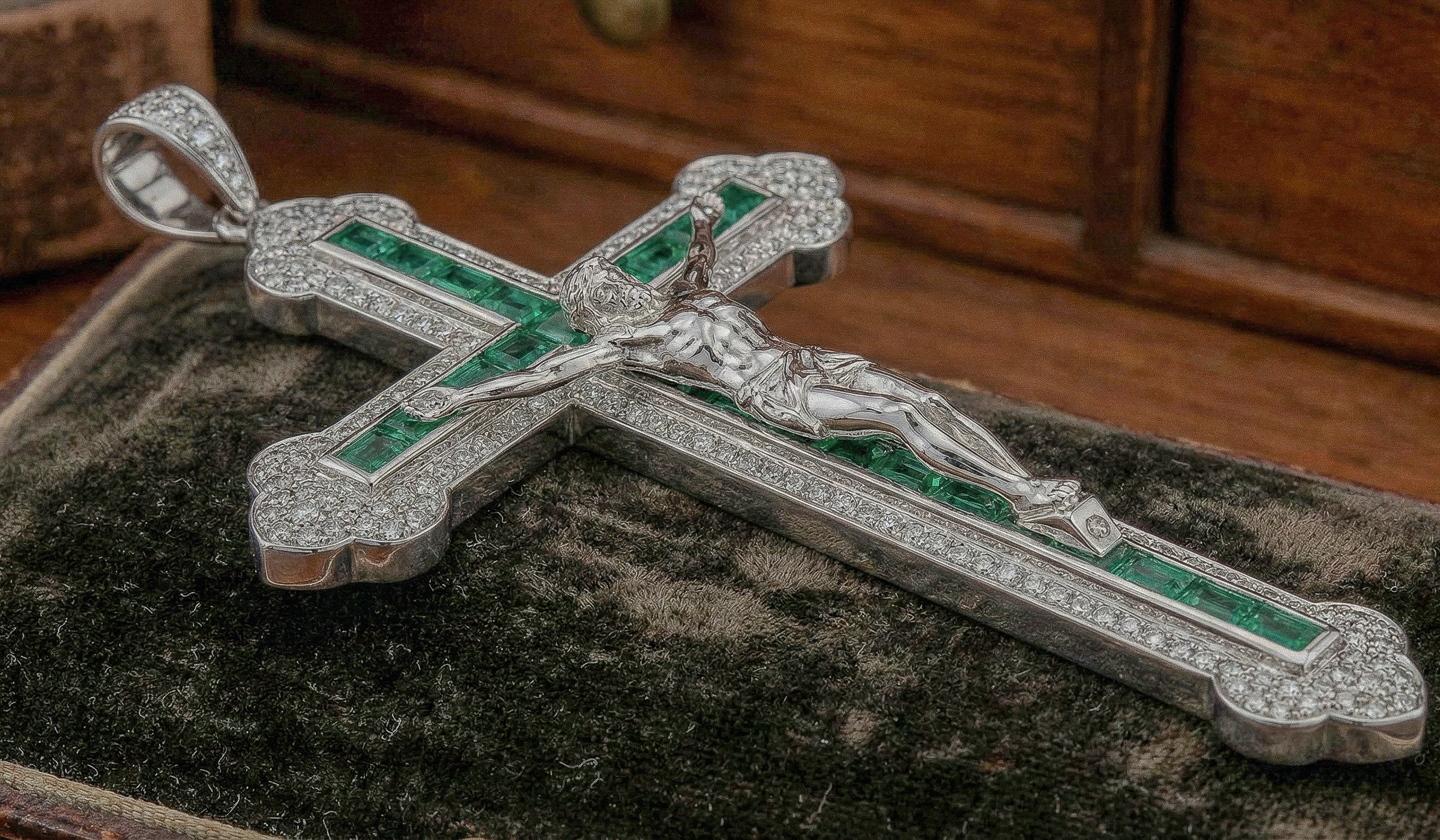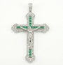 A Christ crucifix platinum chain pendant pave set with emeralds and diamonds